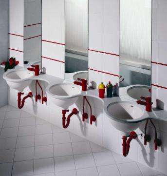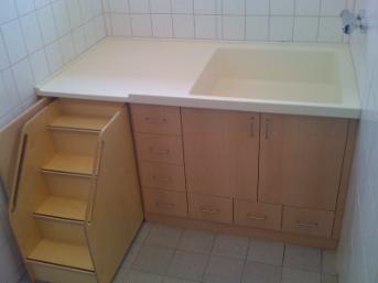 Pflegemodul zur U3-Betreuung mit fugenlos integrierter Duschtasse mit antibakterieller Wirkung sowie Treppenaufgang.